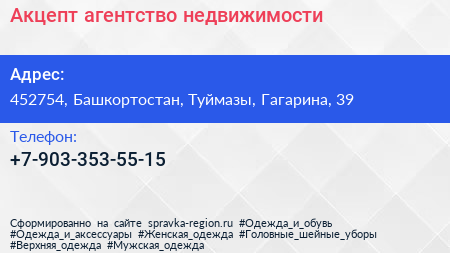 Акцепт, агентство недвижимости по адресу 452754, Башкортостан, Туймазы, Гагарина, 39 в дальнейшем Организация, размещена в следующих категориях: