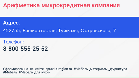 Арифметика, микрокредитная компания по адресу 452755, Башкортостан, Туймазы, Островского, 7 в дальнейшем Организация, размещена в следующих категориях: