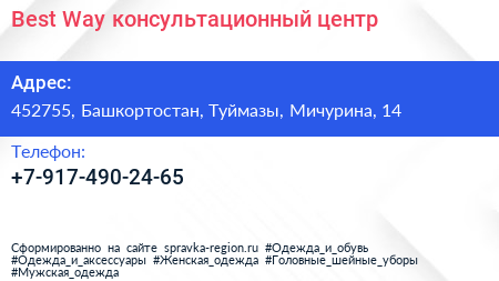Best Way, консультационный центр по адресу 452755, Башкортостан, Туймазы, Мичурина, 14 в дальнейшем Организация, размещена в следующих категориях: