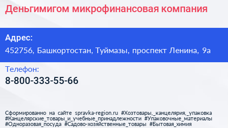 Деньгимигом, микрофинансовая компания по адресу 452756, Башкортостан, Туймазы, проспект Ленина, 9а в дальнейшем Организация, размещена в следующих категориях: