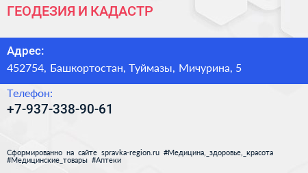 ГЕОДЕЗИЯ И КАДАСТР по адресу 452754, Башкортостан, Туймазы, Мичурина, 5 в дальнейшем Организация, размещена в следующих категориях: