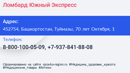 Ломбард Южный Экспресс по адресу 452754, Башкортостан, Туймазы, 70 лет Октября, 1 в дальнейшем Организация, размещена в следующих категориях: