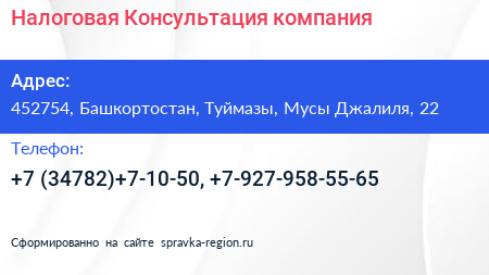 Налоговая Консультация, компания по адресу 452754, Башкортостан, Туймазы, Мусы Джалиля, 22 в дальнейшем Организация, размещена в следующих категориях: