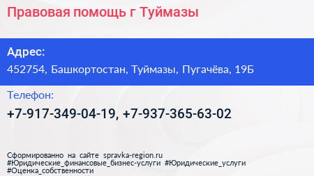 Правовая помощь, г. Туймазы по адресу 452754, Башкортостан, Туймазы, Пугачёва, 19Б в дальнейшем Организация, размещена в следующих категориях: