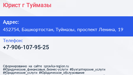 Юрист, г. Туймазы по адресу 452754, Башкортостан, Туймазы, проспект Ленина, 19 в дальнейшем Организация, размещена в следующих категориях: