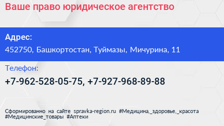 Ваше право, юридическое агентство по адресу 452750, Башкортостан, Туймазы, Мичурина, 11 в дальнейшем Организация, размещена в следующих категориях: