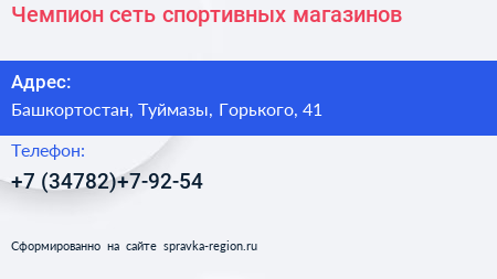 Чемпион, сеть спортивных магазинов по адресу Башкортостан, Туймазы, Горького, 41 в дальнейшем Организация, размещена в следующих категориях: