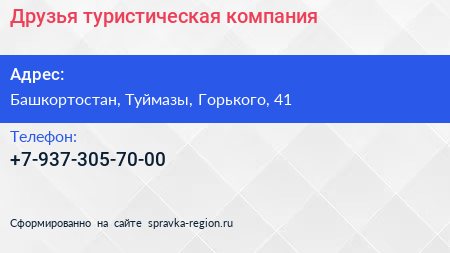 Друзья, туристическая компания по адресу Башкортостан, Туймазы, Горького, 41 в дальнейшем Организация, размещена в следующих категориях: