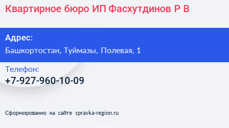 Квартирное бюро, ИП Фасхутдинов Р.В. по адресу Башкортостан, Туймазы, Полевая, 1 в дальнейшем Организация, размещена в следующих категориях: