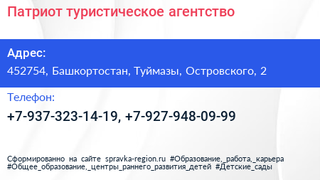 Патриот, туристическое агентство по адресу 452754, Башкортостан, Туймазы, Островского, 2 в дальнейшем Организация, размещена в следующих категориях: