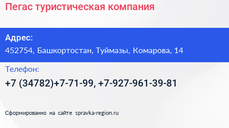 Пегас, туристическая компания по адресу 452754, Башкортостан, Туймазы, Комарова, 14 в дальнейшем Организация, размещена в следующих категориях: