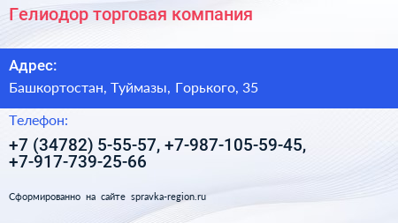 Гелиодор, торговая компания по адресу Башкортостан, Туймазы, Горького, 35 в дальнейшем Организация, размещена в следующих категориях: