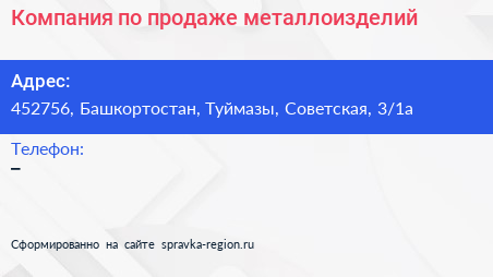 Компания по продаже металлоизделий по адресу 452756, Башкортостан, Туймазы, Советская, 3/1а в дальнейшем Организация, размещена в следующих категориях: