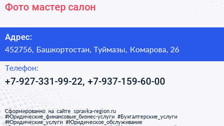 Фото мастер, салон по адресу 452756, Башкортостан, Туймазы, Комарова, 26 в дальнейшем Организация, размещена в следующих категориях: