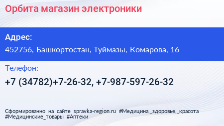 Орбита, магазин электроники по адресу 452756, Башкортостан, Туймазы, Комарова, 16 в дальнейшем Организация, размещена в следующих категориях: