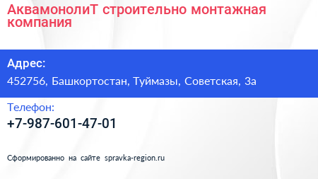 АквамонолиТ, строительно-монтажная компания по адресу 452756, Башкортостан, Туймазы, Советская, 3а в дальнейшем Организация, размещена в следующих категориях: