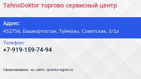 TehnoDoktor, торгово-сервисный центр по адресу 452756, Башкортостан, Туймазы, Советская, 3/1а в дальнейшем Организация, размещена в следующих категориях: