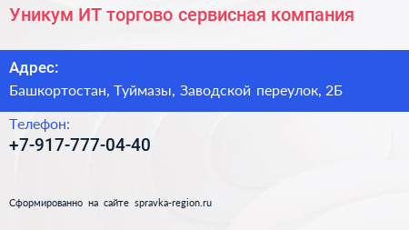 Уникум-ИТ, торгово-сервисная компания по адресу Башкортостан, Туймазы, Заводской переулок, 2Б в дальнейшем Организация, размещена в следующих категориях: