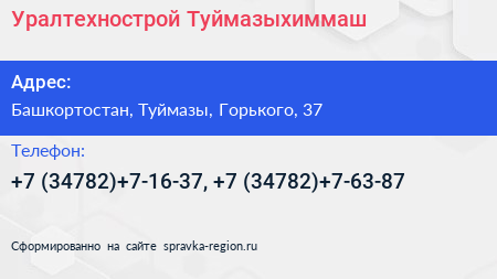 Уралтехнострой-Туймазыхиммаш по адресу Башкортостан, Туймазы, Горького, 37 в дальнейшем Организация, размещена в следующих категориях: