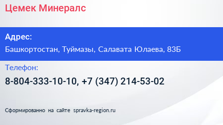 Цемек Минералс по адресу Башкортостан, Туймазы, Салавата Юлаева, 83Б в дальнейшем Организация, размещена в следующих категориях: