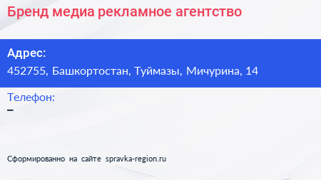 Бренд медиа, рекламное агентство по адресу 452755, Башкортостан, Туймазы, Мичурина, 14 в дальнейшем Организация, размещена в следующих категориях: