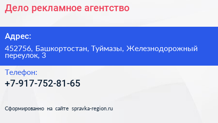 Дело, рекламное агентство по адресу 452756, Башкортостан, Туймазы, Железнодорожный переулок, 3 в дальнейшем Организация, размещена в следующих категориях: