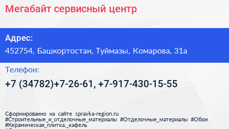 Мегабайт, сервисный центр по адресу 452754, Башкортостан, Туймазы, Комарова, 31а в дальнейшем Организация, размещена в следующих категориях: