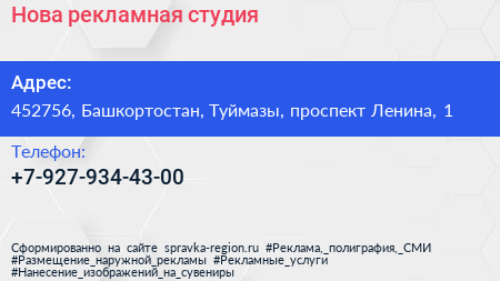 Нова, рекламная студия по адресу 452756, Башкортостан, Туймазы, проспект Ленина, 1 в дальнейшем Организация, размещена в следующих категориях:
