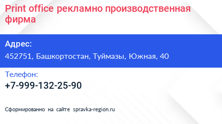 Print office, рекламно-производственная фирма по адресу 452751, Башкортостан, Туймазы, Южная, 40 в дальнейшем Организация, размещена в следующих категориях: