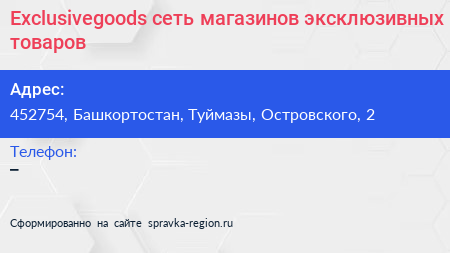 Exclusivegoods, сеть магазинов эксклюзивных товаров по адресу 452754, Башкортостан, Туймазы, Островского, 2 в дальнейшем Организация, размещена в следующих категориях: