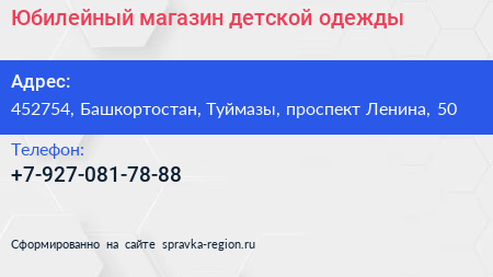 Юбилейный, магазин детской одежды по адресу 452754, Башкортостан, Туймазы, проспект Ленина, 50 в дальнейшем Организация, размещена в следующих категориях: