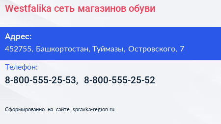 Westfalika, сеть магазинов обуви по адресу 452755, Башкортостан, Туймазы, Островского, 7 в дальнейшем Организация, размещена в следующих категориях: