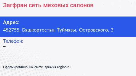 Загфран, сеть меховых салонов по адресу 452755, Башкортостан, Туймазы, Островского, 3 в дальнейшем Организация, размещена в следующих категориях: