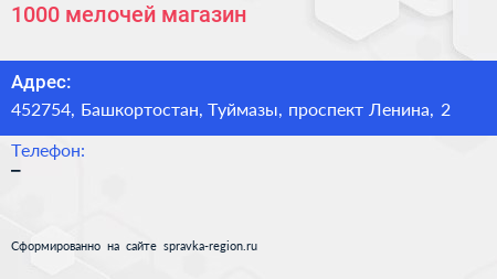 1000 мелочей, магазин по адресу 452754, Башкортостан, Туймазы, проспект Ленина, 2 в дальнейшем Организация, размещена в следующих категориях: