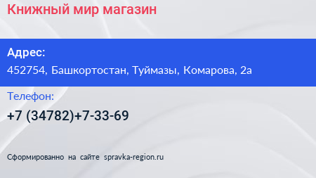 Книжный мир, магазин по адресу 452754, Башкортостан, Туймазы, Комарова, 2а в дальнейшем Организация, размещена в следующих категориях: