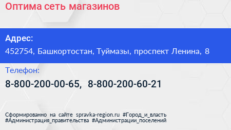 Оптима, сеть магазинов по адресу 452754, Башкортостан, Туймазы, проспект Ленина, 8 в дальнейшем Организация, размещена в следующих категориях: