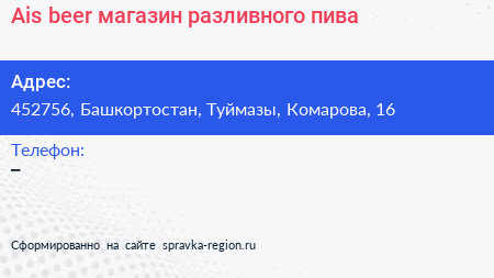 Ais&beer, магазин разливного пива по адресу 452756, Башкортостан, Туймазы, Комарова, 16 в дальнейшем Организация, размещена в следующих категориях: