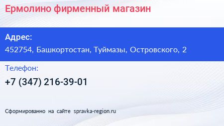 Ермолино, фирменный магазин по адресу 452754, Башкортостан, Туймазы, Островского, 2 в дальнейшем Организация, размещена в следующих категориях: