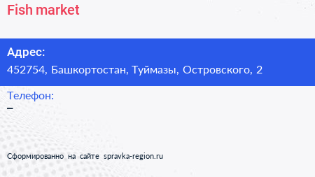 Fish market по адресу 452754, Башкортостан, Туймазы, Островского, 2 в дальнейшем Организация, размещена в следующих категориях: