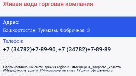 Живая вода, торговая компания по адресу Башкортостан, Туймазы, Фабричная, 3 в дальнейшем Организация, размещена в следующих категориях: