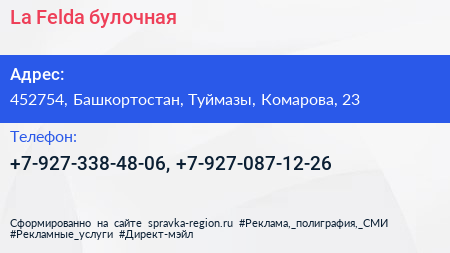 La Felda, булочная по адресу 452754, Башкортостан, Туймазы, Комарова, 23 в дальнейшем Организация, размещена в следующих категориях: