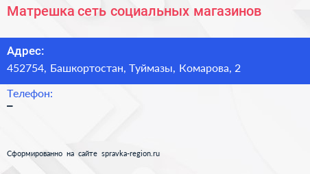 Матрешка, сеть социальных магазинов по адресу 452754, Башкортостан, Туймазы, Комарова, 2 в дальнейшем Организация, размещена в следующих категориях: