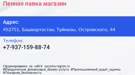 Пенная лавка, магазин по адресу 452751, Башкортостан, Туймазы, Островского, 44 в дальнейшем Организация, размещена в следующих категориях: