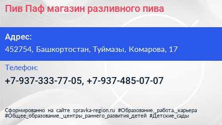 Пив Паф, магазин разливного пива по адресу 452754, Башкортостан, Туймазы, Комарова, 17 в дальнейшем Организация, размещена в следующих категориях: