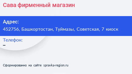 Сава, фирменный магазин по адресу 452756, Башкортостан, Туймазы, Советская, 7 киоск в дальнейшем Организация, размещена в следующих категориях: