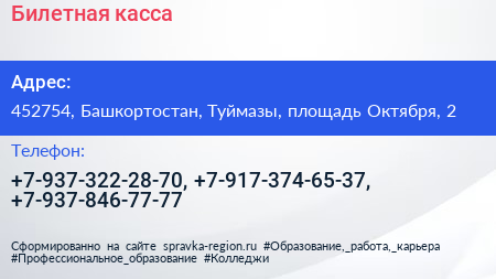 Билетная касса по адресу 452754, Башкортостан, Туймазы, площадь Октября, 2 в дальнейшем Организация, размещена в следующих категориях: