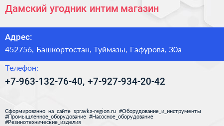 Дамский угодник, интим-магазин по адресу 452756, Башкортостан, Туймазы, Гафурова, 30а в дальнейшем Организация, размещена в следующих категориях: