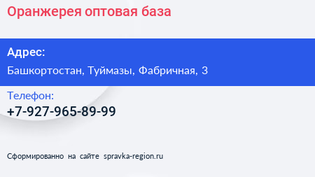 Оранжерея, оптовая база по адресу Башкортостан, Туймазы, Фабричная, 3 в дальнейшем Организация, размещена в следующих категориях: