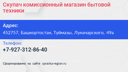 Скупач, комиссионный магазин бытовой техники по адресу 452757, Башкортостан, Туймазы, Луначарского, 49а в дальнейшем Организация, размещена в следующих категориях: