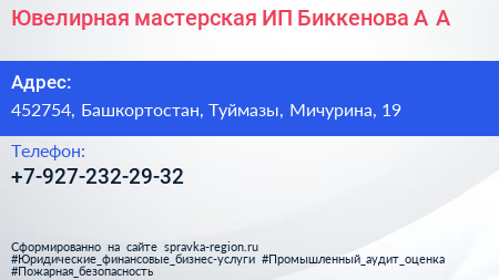 Ювелирная мастерская, ИП Биккенова А.А. по адресу 452754, Башкортостан, Туймазы, Мичурина, 19 в дальнейшем Организация, размещена в следующих категориях:
